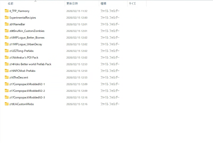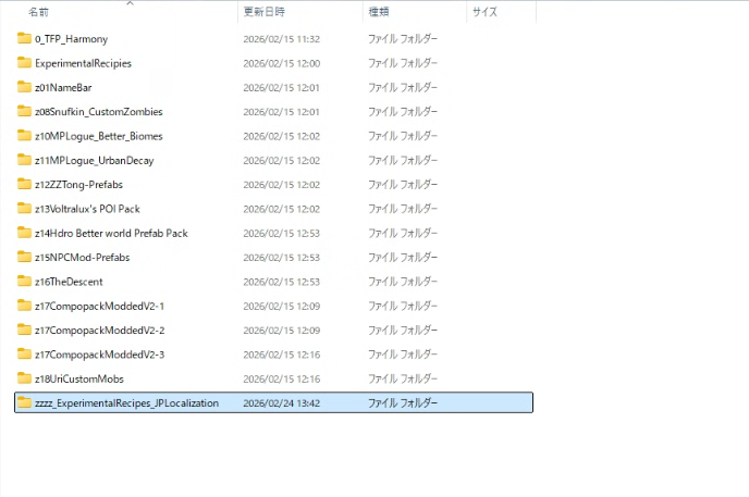 先ほど導入したMOD本体のある『Mods』フォルダーに、ダウンロードして展開した「zzzz_ExperimentalRecipes_JPLocalization」というフォルダーをそのままコピーしてください。他のフォルダも上書きしてください。図のように配置出来たらインストールは完了となります。