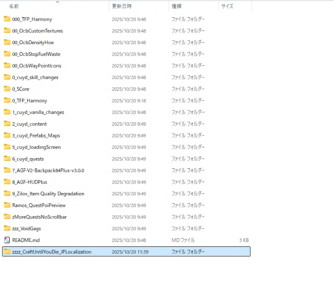 「Mods」フォルダの中に「zzzz_CraftUntilYouDie_JPLocalization」というフォルダが下記図のように配置出来たらインストールは完了となります。