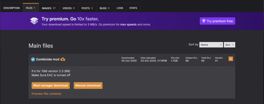 まずはMOD自体をダウンロード、インストールしてください。Zombicide modは7D2D MOD LAUNCHERから導入することが出来ません。手動による導入となります。