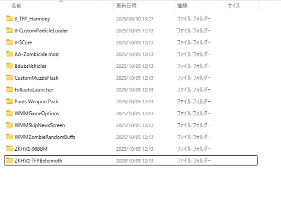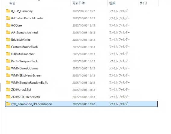 展開して出来たフォルダの中身にある『zzzz_Zombicide_JPLocalization』というフォルダを7days本体の『Mods』フォルダにコピーしてください。『Mods』フォルダの中が図のように配置出来ていたらインストールは完了となります。